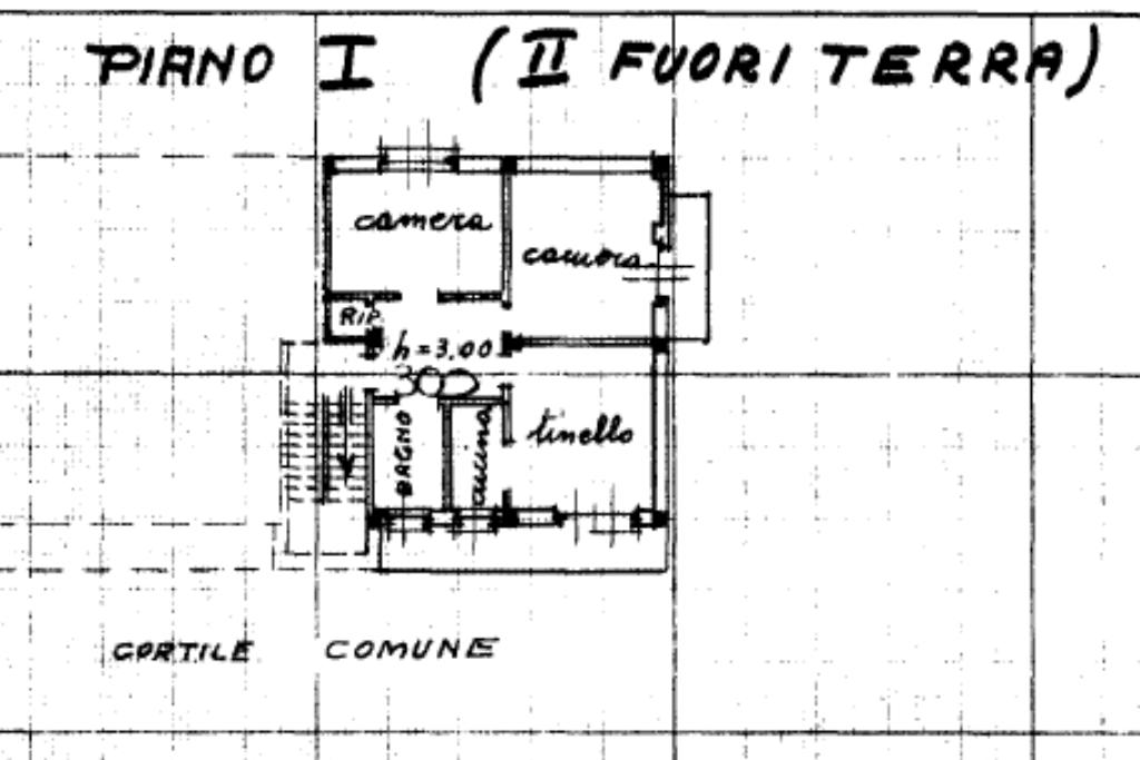L'ingresso avviene sul disimpegno che collega tutti i locali ovvero il tinello con cucinino, due camere da letto matrimoniali, il ripostiglio ed il bagno completo di vasca.