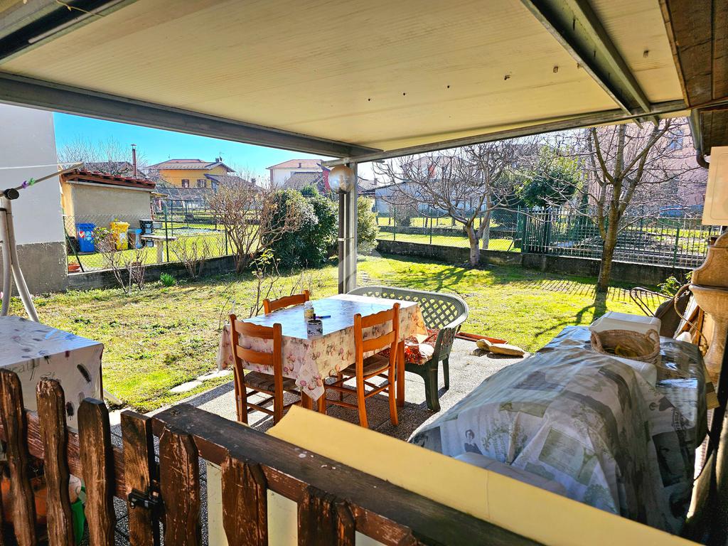 Fronte casa, dall'altro lato della via, si trova il giardino privato di 300 mq, distaccato di pochi metri. Una parte della proprietà è piastrellata e funge da posto auto, il resto è a verde. Nel giardino si trovano due tettoie e una piccola dependance con al piano terreno una cucina e al primo piano camera e bagno.