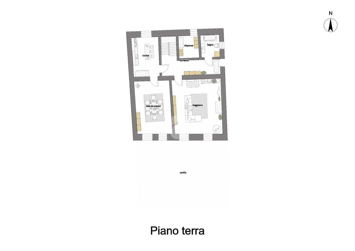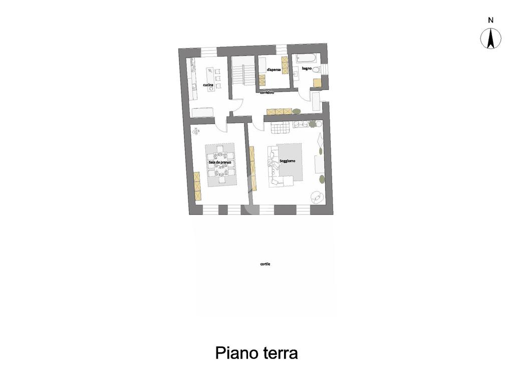 Il piano terra, caratterizzato dalla presenza del cotto, si compone di cucina abitabile, sala da pranzo con affaccio sul cortile, salone doppio con grande camino a legna e volte sul soffitto, bagno con vasca ed ampia dispensa. Termina il piano il cortile privato, recintato e coperto per poterlo utilizzare anche come ricovero dell'auto.